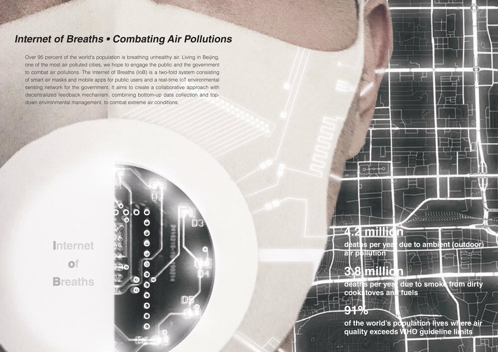 The Internet of Breaths (IoB) derives from such dynamic situation. IoB is a two-fold system consisting of smart air masks and a mobile app for public users and a real-time IoT environmental sensing network for the government. It aims to create a collaborative approach with decentralized feedback mechanism, combining bottom-up data collection and top-down environmental management, to combat extreme air conditions and to foster a community that pays adequate attention to air pollution and public health.